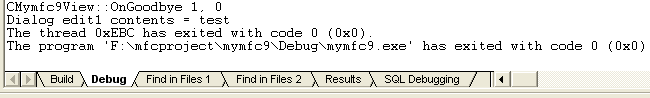 Using the CView class rather than the CMymfc9View class allows the dialog class to be used with any view class. Edit mymfc9Dialog.h to define the WM_GOODBYE message ID. Add the following line of code: