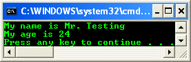/* the main() */ int main(){/* variables */int num=24;char name[ ]="Mr. Testing";printf("My name is %s\n",name); printf("My age is %d\n",num);return 0;}