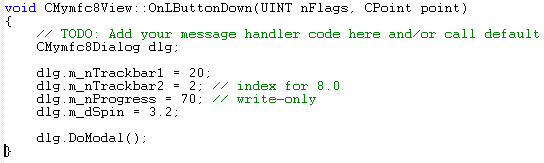 We're using a double instead of an int because the int would require almost no programming, and that would be too easy. We want the edit control range to be 0.0 to 10.0, but the spin control itself needs an integer range. Add the following code to OnInitDialog() to set the spin control range to 0 to 100 and to set its initial value to m_dSpin * 10.0:
